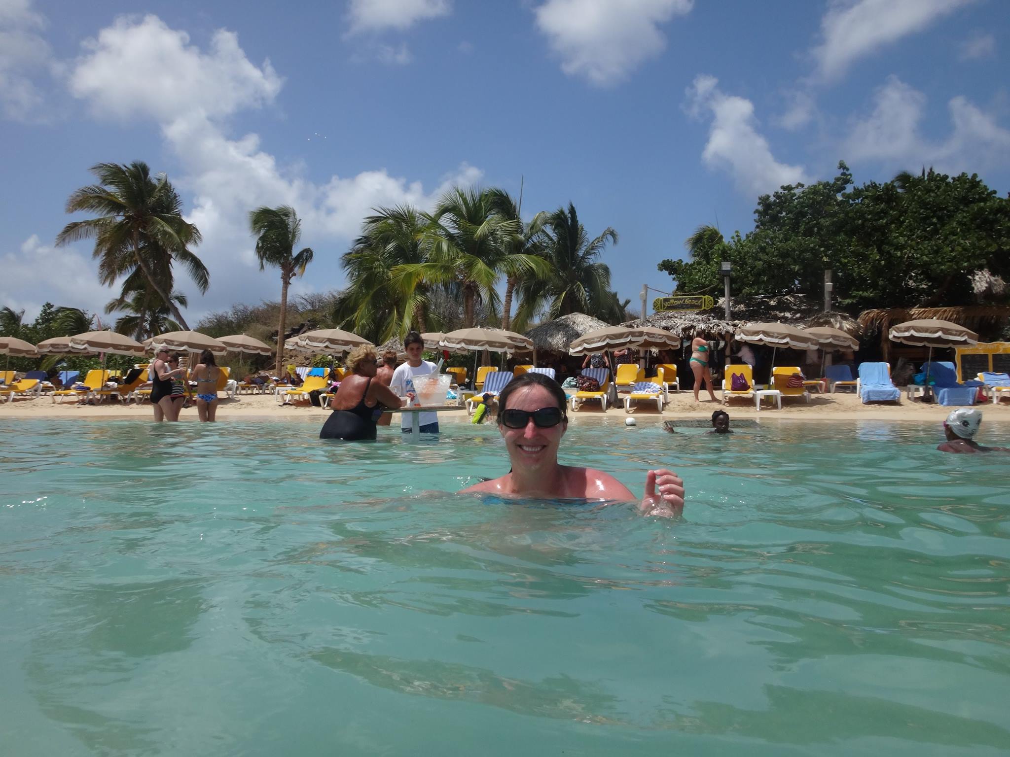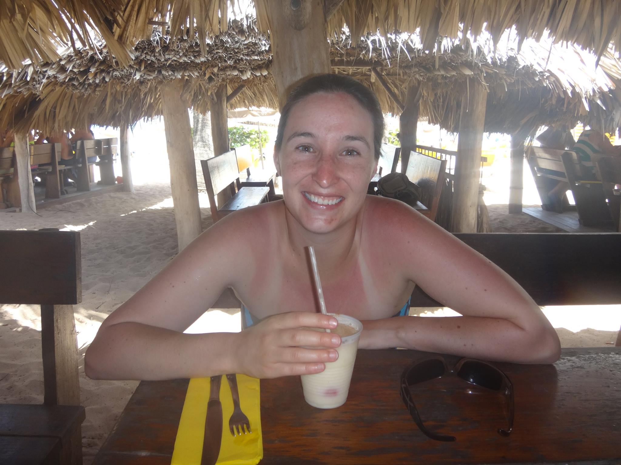 Once we arrived at the Yellow Beach restaurant we were seated in a small tiki-hut with a wooden table and benches underneath. Meals were included in our tour so we each got to pick one meat and one side. The choices were chicken or ribs. For a side we had a choice between french fries and ratatouille. Of course we ordered one of each. Sadly, I didn’t get any pictures of our meal, just my lovely tan lines. Both the chicken and ribs were good. The french fries were pretty basic. But the ratatouille was excellent. And Brian is now so obsessed with ratatouille after eating there that he orders it anywhere he can get it. Overall, the food was good, but it wasn’t anything fancy. But I’ve eaten a lot of food provided on excursions and have to say that the Yellow Beach ranks near the top comparatively.